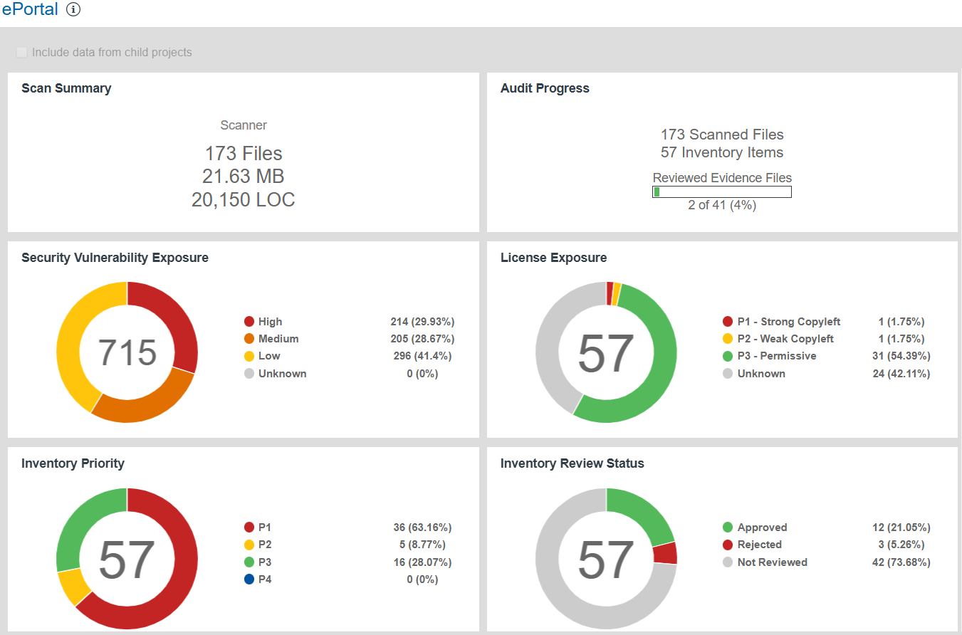 When you select a project in the Projects pane, the project’s dashboard is displayed, providing you with an interactive view of your project, including security-vulnerability and license exposure, codebase and inventory review statistics, and other information. The following topics describe this dashboard.