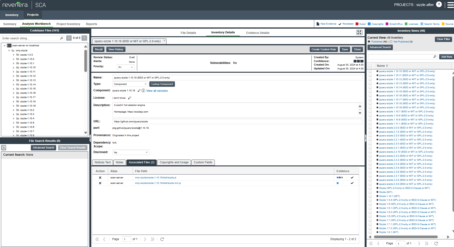 The scanning of codebase files will not generate inventory items that have a matching CVL (Component Version License). However, if multiple inventory items with the same CVL are generated during scanning, these inventory items will be merged with an existing inventory item that has the same CVL, based on the recent updated timestamp of the inventory items. This process updates the Relationship field values, indicating whether it is Parent Inventory or Child Inventory and the Dependency Level field values, specifying whether it is Top-level, Direct, or Transitive on the Project Inventory Details pane—for the existing inventory item. It also updates the file associations in the Associated Files tab—both on the Project Inventory Details pane and on the Inventory Details pane in the Analysis Workbench —for the existing inventory item.