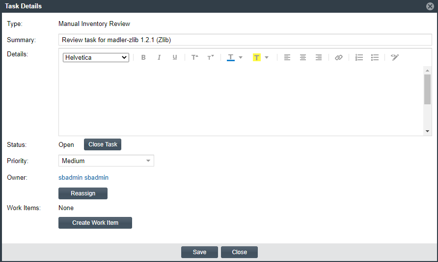 To update the task fields or add an external work item, refer to the descriptions in Manually Creating a Task.
